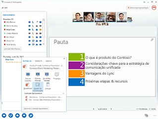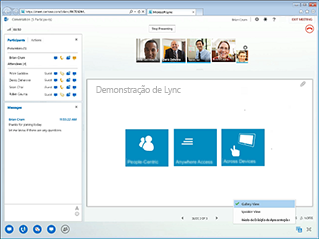 O Lync Web App permite que usuários de PC e Mac ingressem em uma reunião do Lync em um navegador e proporciona uma experiência de reunião online completa com mensagens instantâneas, voz, vídeo de vários participantes, colaboração e compartilhamento de dados.