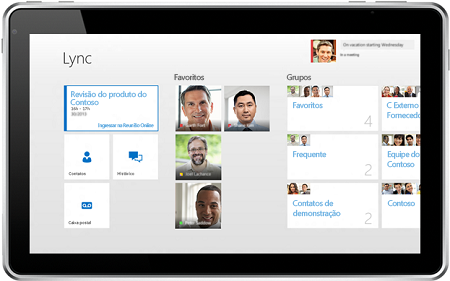 O Lync facilita a comunicação com uma experiência familiar e consistente disponível em PCs com Windows, no Windows Phone, no iOS, no Mac e em smartphones Android. O novo aplicativo imersivo do Lync para Windows 8 e Windows RT proporciona uma experiência de primeiro toque contínua.